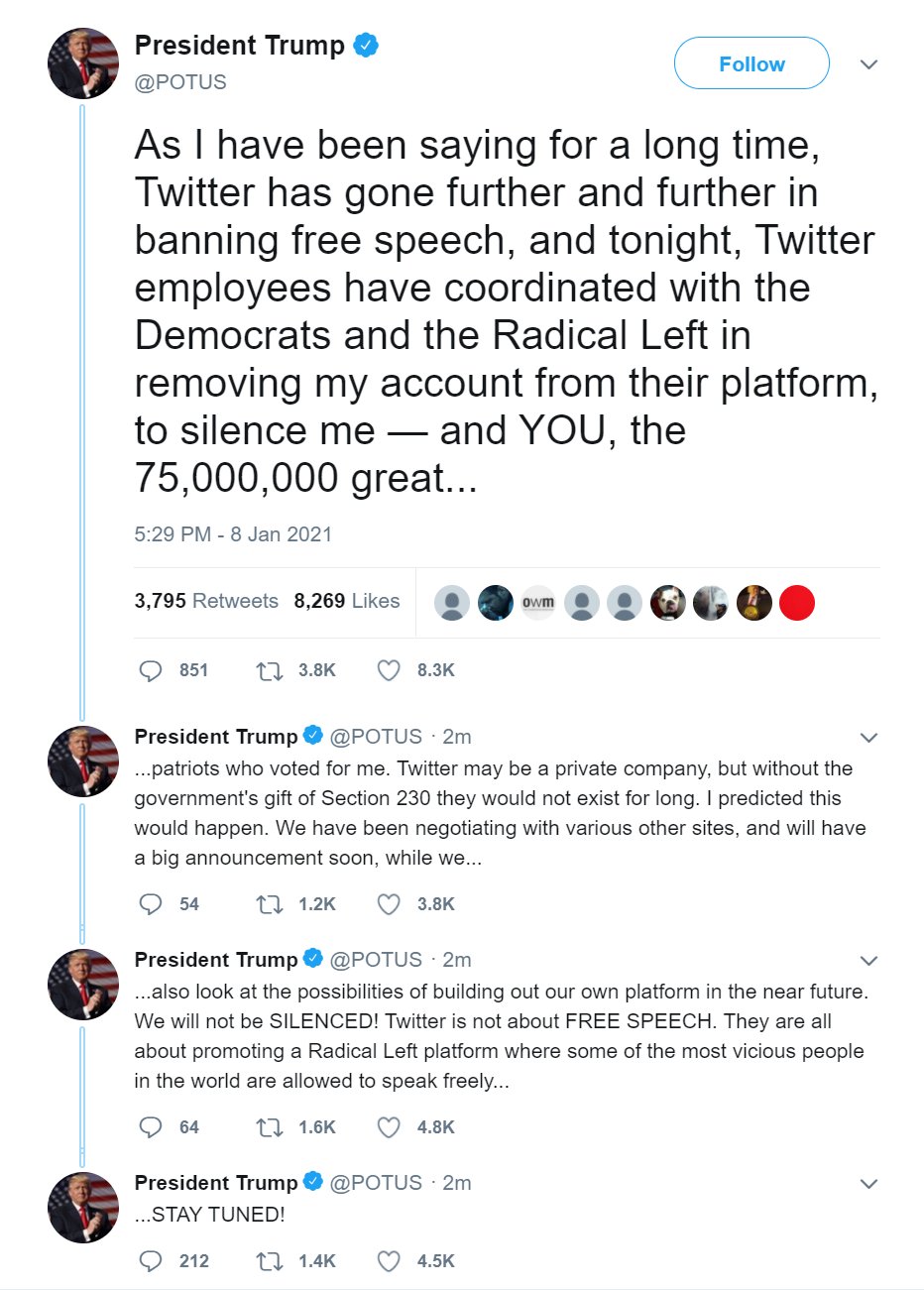 “After close review of recent Tweets from the @realDonaldTrump account and the context around them — specifically how they are being received and interpreted on and off Twitter — we have permanently suspended the account due to the risk of further incitement of violence.” (